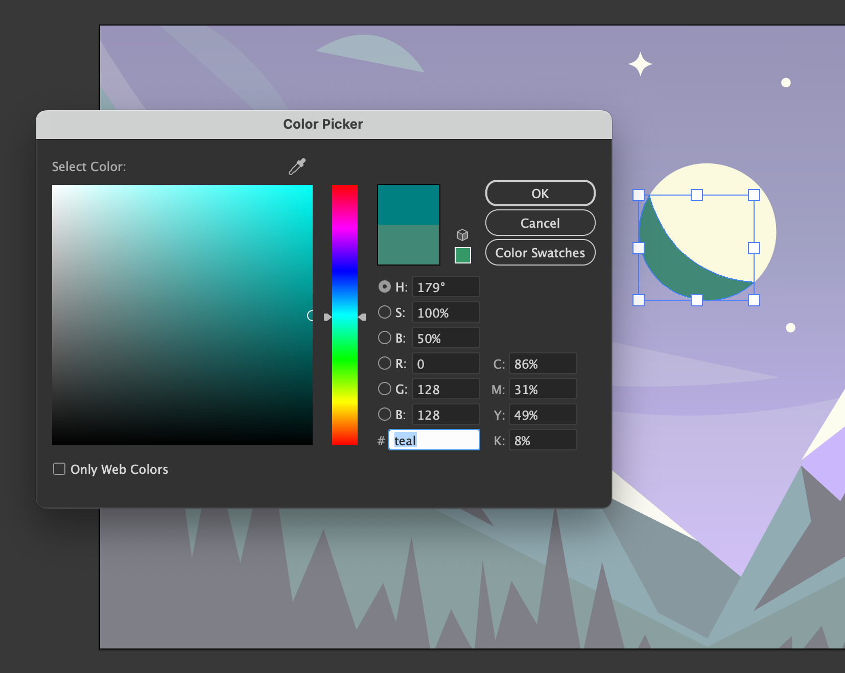 The Color Picker dialog in Illustrator has been updated to allow direct input of color names and values. You can now type common color words like “mint” or “teal” and Illustrator will automatically find the closest color match. Of course, you can still enter HEX, RGB, or CMYK values for precise control.