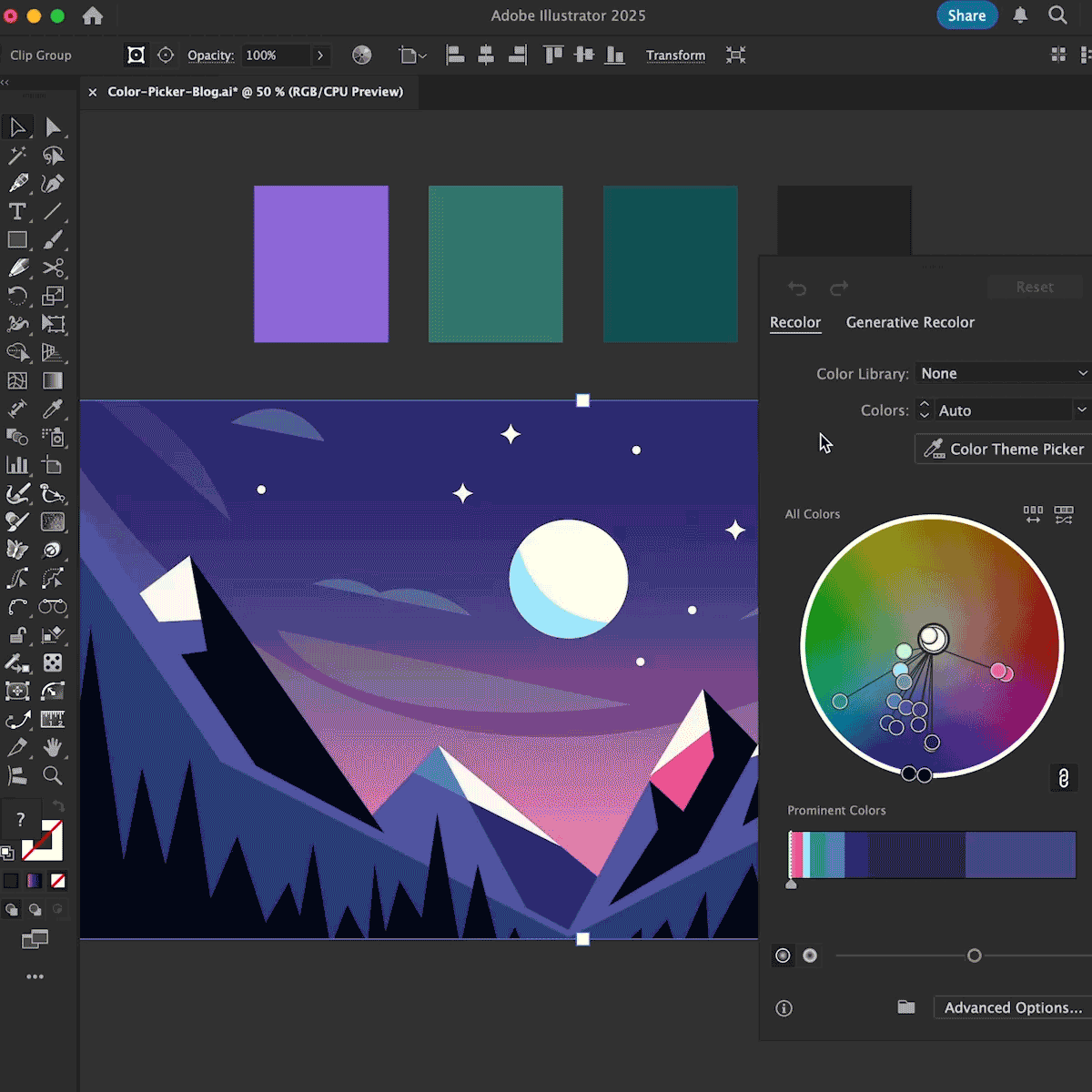 Open it via Edit > Edit Colors > Recolor Artwork or click the color wheel icon in the Properties panel. The Recolor panel lets you: