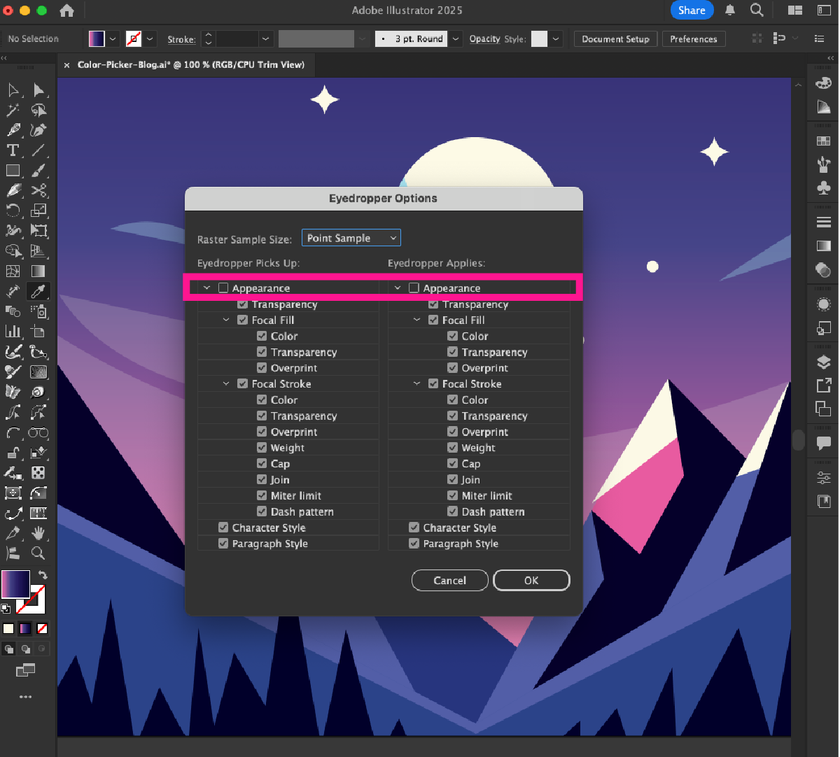 The key thing to understand when picking color in Illustrator is how each tool behaves when sampling or applying color. The classic Eyedropper Tool (I) can pick both appearance attributes and color values, depending on how you use it.