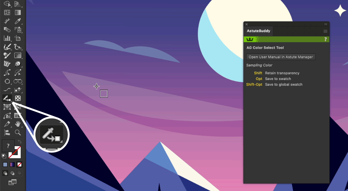 AG Color Select is an Astute Graphics tool for Adobe Illustrator that makes picking colors from your artwork faster and more precise. Unlike the native Eyedropper, AG Color Select can grab colors even from live effects and transparency, giving you more control over complex artwork. It's simple to use and works seamlessly alongside Illustrator’s built-in tools.